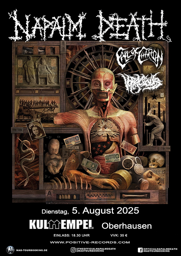 NAPALM DEATHCALL OF SHARON VORACIOUS Einlass: 18:30 Tickets Am 05. August 2025 bebt der Kulttempel Oberhausen, wenn die britischen Grindcore-Legenden Napalm Death die Bühne entern! Mit im Gepäck: die brachiale Energie ihrer neuesten Veröffentlichungen – kompromisslos, politisch und laut wie eh und je. Unterstützt werden sie von Call Of Charon, die mit ihrer wuchtigen Mischung aus Deathcore und Groove Metal für einen zerstörerischen Auftakt sorgen, sowie von Voracious, die mit düsterem Extrem-Metal und unbändiger Live-Power das Fundament legen. Ein Abend voller Blastbeats, Riffs und rauer Intensität – nichts für schwache Nerven, aber ein Muss für alle Freunde extremer Musik!