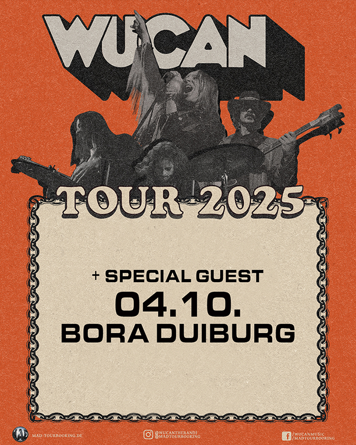 MAD Tourbooking präsentiert WUCAN + special guest Einlass 19:00 Start 20:00 Tickets Am 4. Oktober 2025 erwartet das Publikum im Bora Duisburg ein außergewöhnlicher Abend mit zwei herausragenden Bands der modernen Rock- und Psychedelic-Szene: Wucan und Special guest (geben wir bald bekannt)! Die Dresdner Band Wucan, um Frontfrau und Multiinstrumentalistin Francis Tobolsky, hat sich mit ihrem einzigartigen Mix aus Hard Rock, Progressive Rock und Folk-Elementen eine treue Fangemeinde erspielt. Mit kraftvollem Gesang, virtuosem Flötenspiel und energiegeladenen Riffs entfesseln Wucan eine mitreißende Bühnenpräsenz, die an die goldene Ära des Rock erinnert.