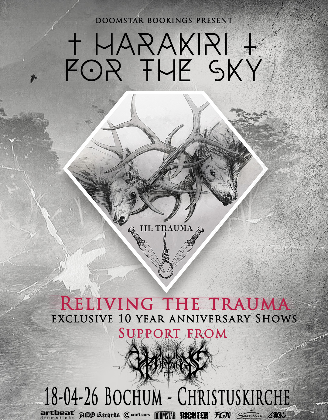Doomstar Bookings präsentiert HARAKIRI FOR THE SKYTrauma Anniversary show 2026Support HAERESIS Einlass 19:00 Start 20:00 Tickets Harakiri for the Sky – Jubiläumsshow von „Trauma“ in voller Länge in der Christuskirche Bochum Am 18. April 2026 laden Harakiri for the Sky zu einem außergewöhnlichen Konzerterlebnis im Herzen des Ruhrgebiets: In der Christuskirche Bochum zelebriert die österreichische Post-Black-Metal-Formation das 10-jährige Jubiläum ihres Albums „Trauma“ und spielt das Werk in seiner gesamten Länge – ein Ereignis, das es so nur selten zu erleben gibt. Als das Duo 2016 „Trauma“ veröffentlichte, markierte das Album einen Wendepunkt in ihrer Karriere. Die Verbindung aus eruptiver Wucht, melancholischer Tiefe und eindringlicher Melodik verschaffte ihnen internationale Aufmerksamkeit und festigte ihren Ruf als Vorreiter eines modernen, emotional geprägten Post-Black-Metal-Sounds. Songs wie „Calling the Rain“ oder „Thanatos“ haben bis heute nichts von ihrer Intensität verloren und berühren durch ihre Kombination aus introspektiven Texten, dynamischer Instrumentierung und filmischer Dramaturgie. Dass die Band dieses Album nun in voller Länge auf die Bühne bringt, ist nicht nur eine Hommage an einen Meilenstein ihrer Diskografie, sondern auch ein Geschenk an die Fans, die „Trauma“ über die Jahre hinweg begleitet hat. Die Möglichkeit, die ursprüngliche Dramaturgie und emotionale Tiefe des Albums live und als geschlossenes Werk zu erleben, macht diesen Abend zu einem besonderen Ereignis innerhalb ihrer Konzertgeschichte. Der Schauplatz könnte dabei kaum passender sein: Die Christuskirche Bochum, längst etabliert als Ort für außergewöhnliche kulturelle Veranstaltungen, vereint monumentale Architektur, erhabene Atmosphäre und eine Akustik, die Klangräume intensiv erfahrbar macht. Wo sonst sakrale Stille dominiert, trifft an diesem Abend verzweifelte Schönheit auf rohe Energie – ein Spannungsfeld, das Harakiri for the Sky seit jeher meisterhaft verkörpern. Mit ihrer Mischung aus atmosphärischer Dichte, emotionaler Wucht und kompromisslosem Ausdruck zählen Harakiri for the Sky zu den herausragenden europäischen Acts ihres Genres. Die Jubiläumsshow von „Trauma“ in Bochum verspricht ein Konzerterlebnis, das weit über die Grenzen klassischer Metal-Liveshows hinausgeht. Ein Pflichttermin für langjährige Begleiter der Band, Liebhaber intensiver Musikmomente und all jene, die Live-Erfahrungen jenseits des Gewöhnlichen suchen.